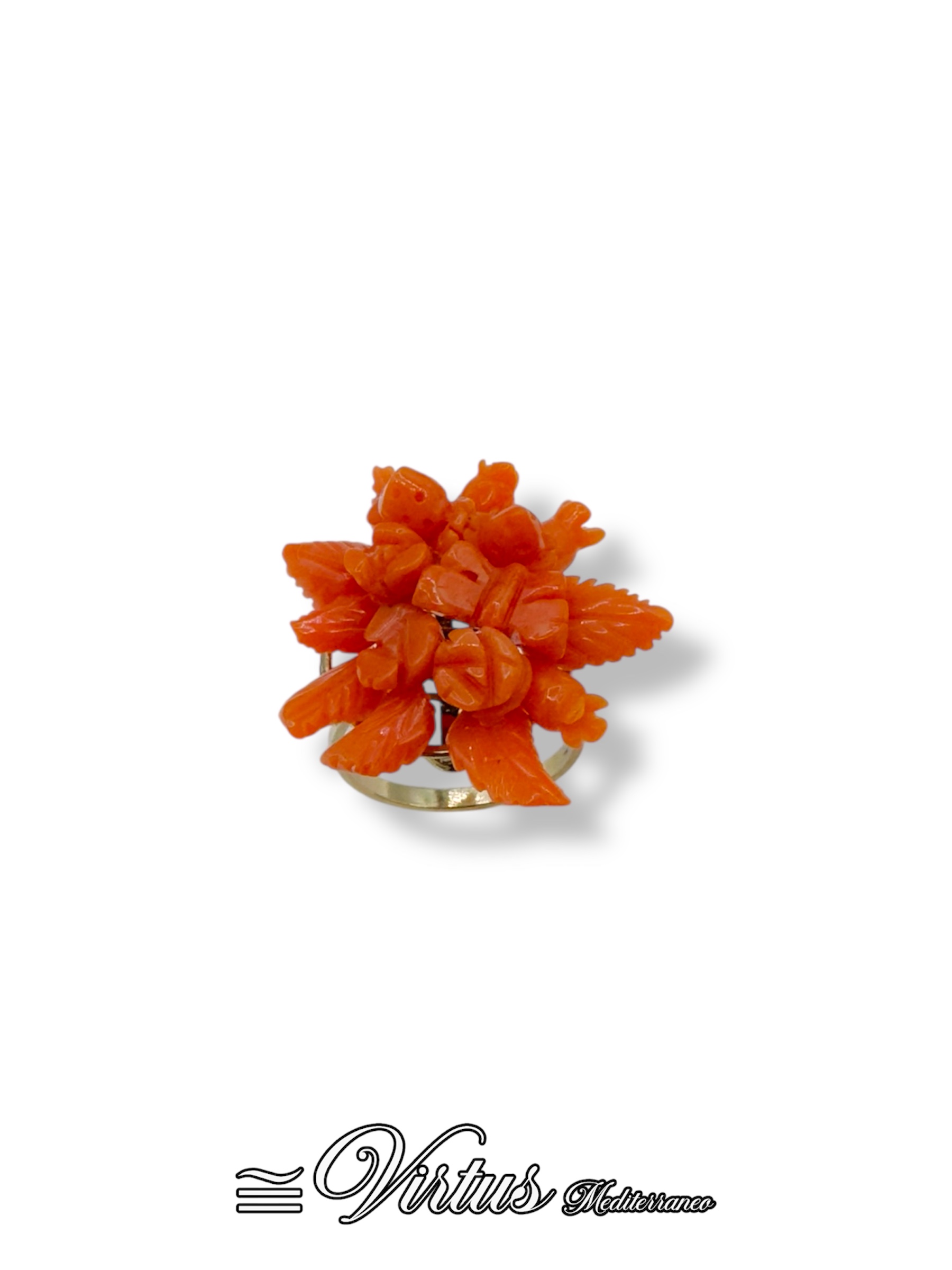 Anello artigianale di corallo Sciacca in oro 9 kt. e corallo frutta e fiori
