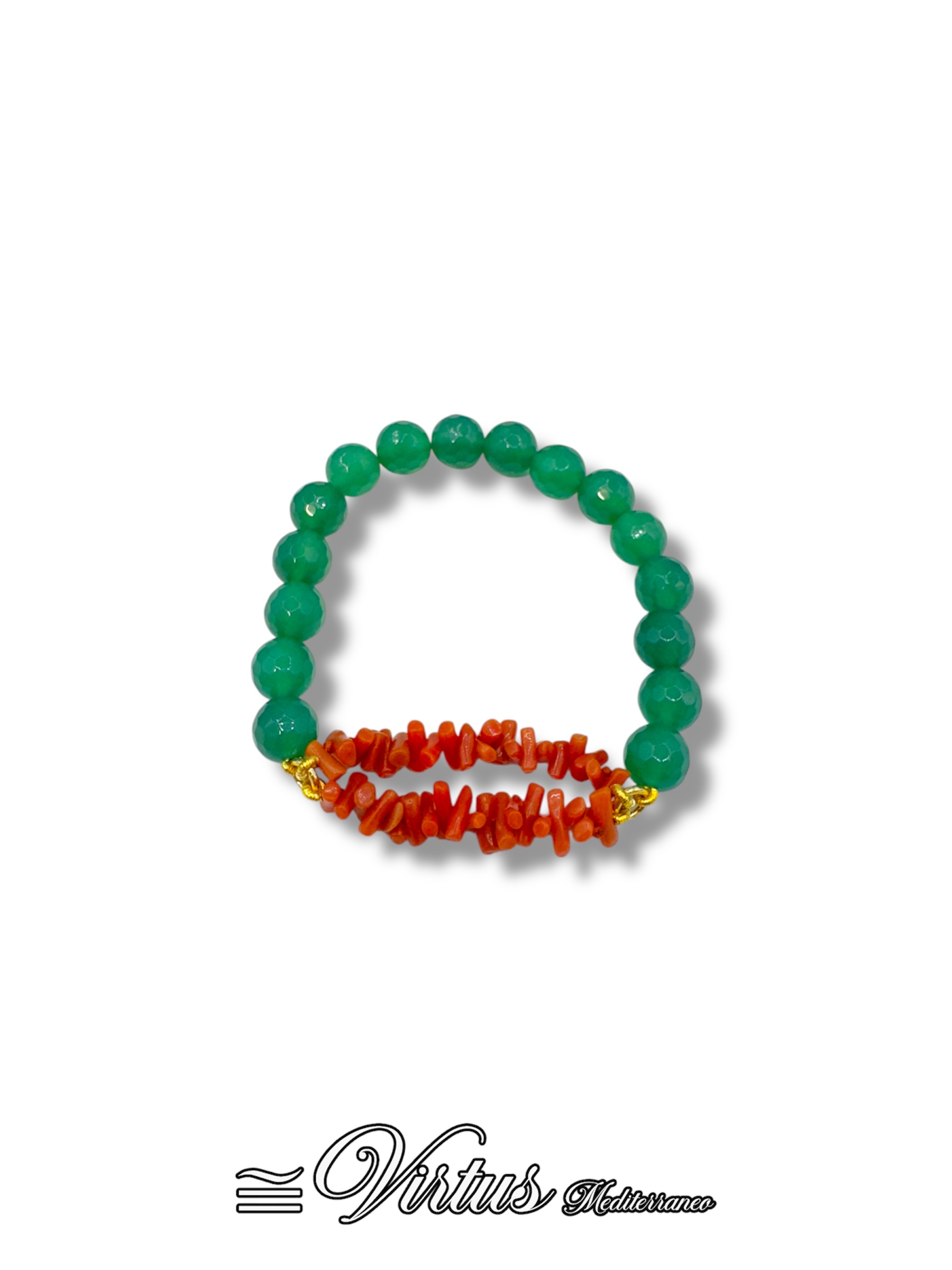 Bracciale elastico artigianale corallo Sciacca con agata verde