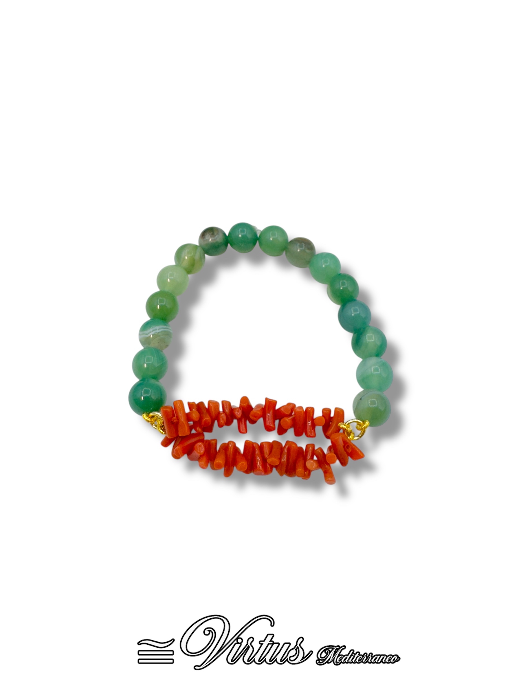 Bracciale elastico artigianale corallo Sciacca con agata verde