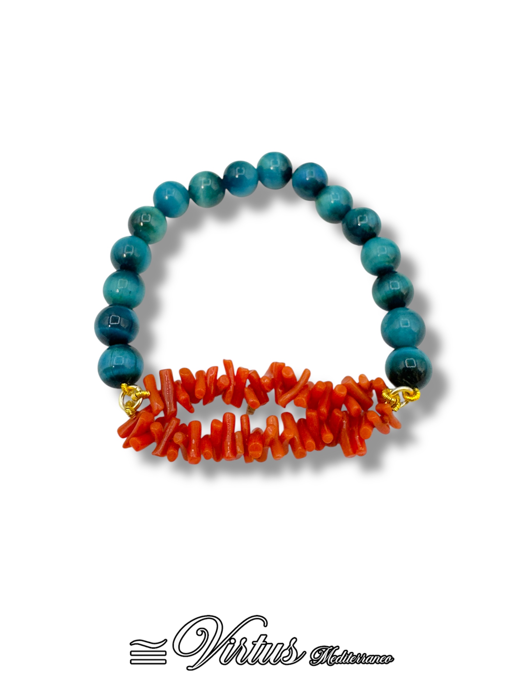 Bracciale elastico artigianale corallo Sciacca con sfere a occhio di tigre