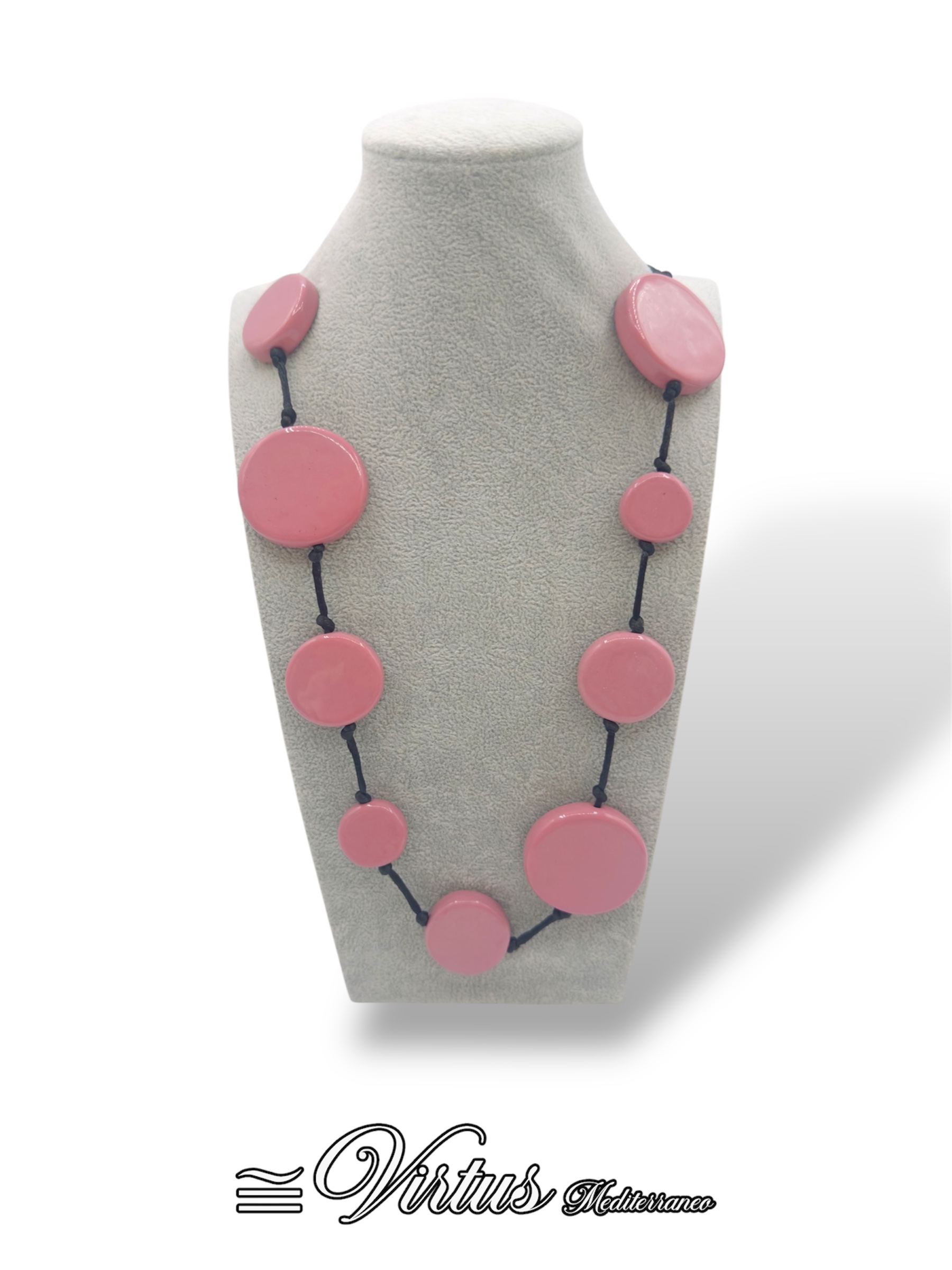 Collana a cerchi artigianali Rosa in ceramica con laccio coda di topo (3 mm) e chiusura acciaio inox anallergico