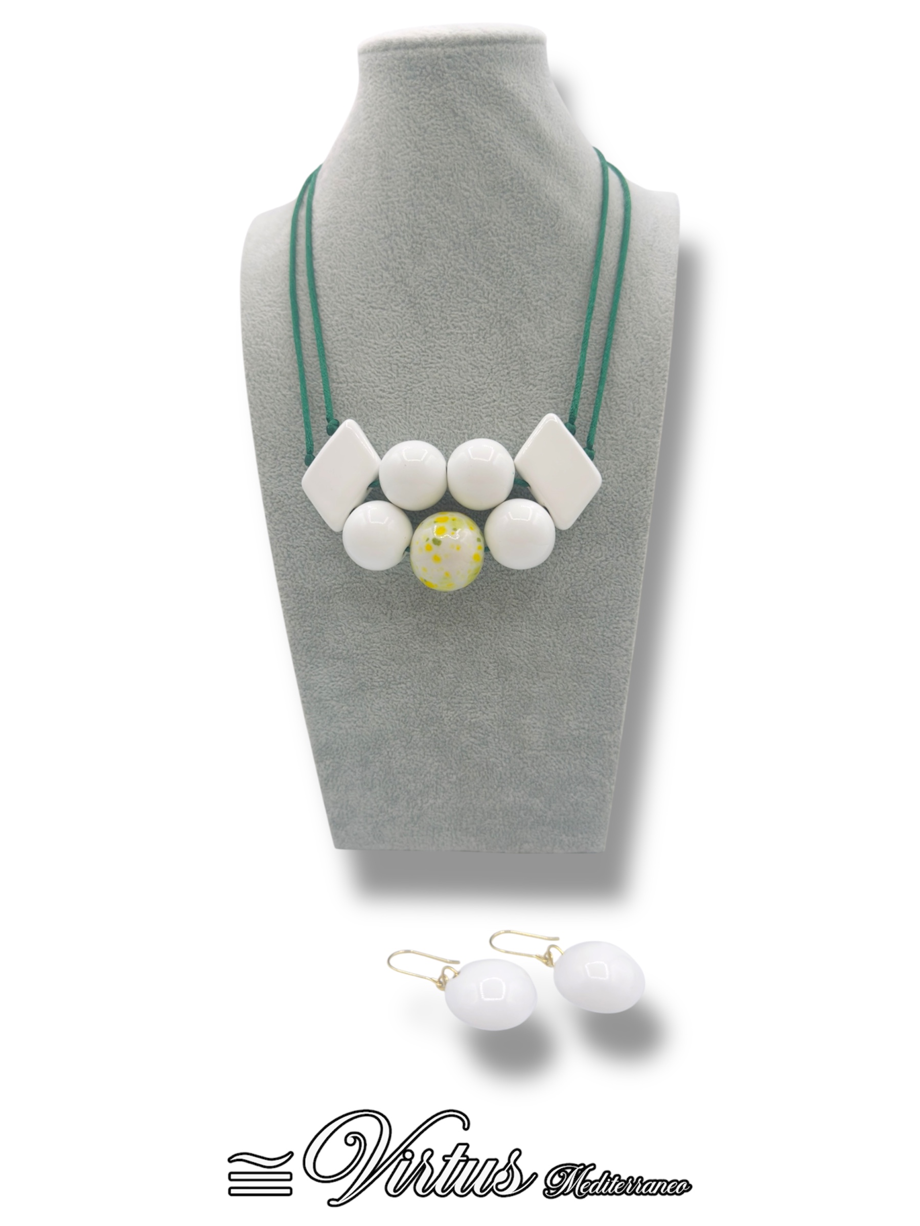 Collana a grappolo artigianale in ceramica con laccio coda di topo (3mm) con orecchini artigianali in ceramica con chiusura e monachelle in acciaio inox anallergico abbinati multi colore