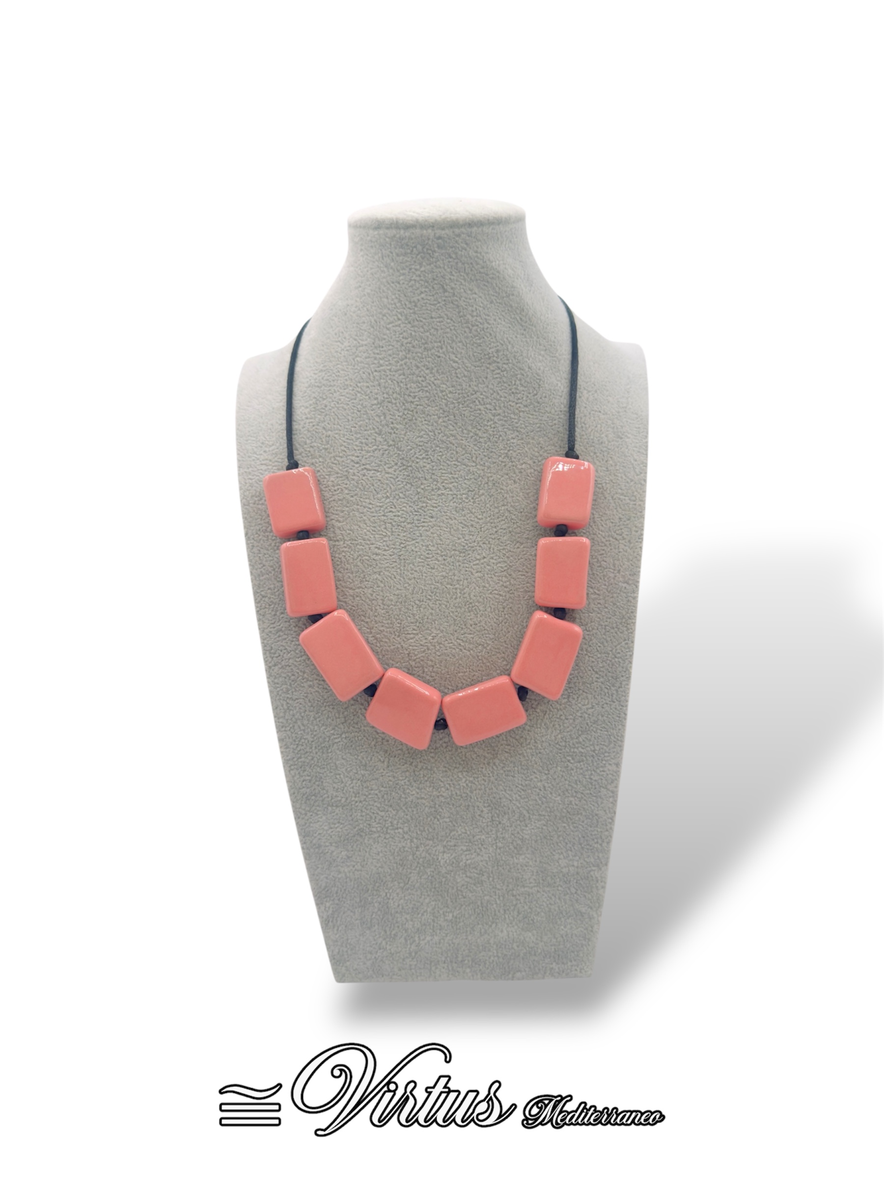 Collana a rettangoli artigianali Rosa in ceramica con laccio coda di topo (3mm) e chiusura acciaio inox anallergico