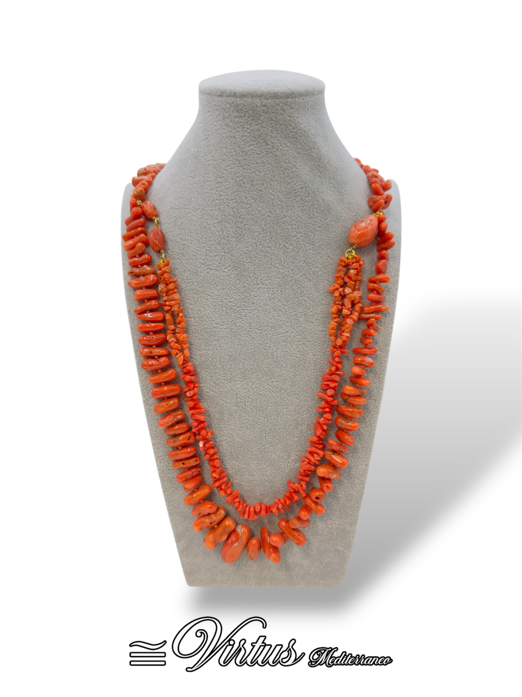 Collana artigianale di corallo Sciacca a 2 fili con pietre, cupolini e cupoloni grezzi di corallo. Chiusura in argento 925.