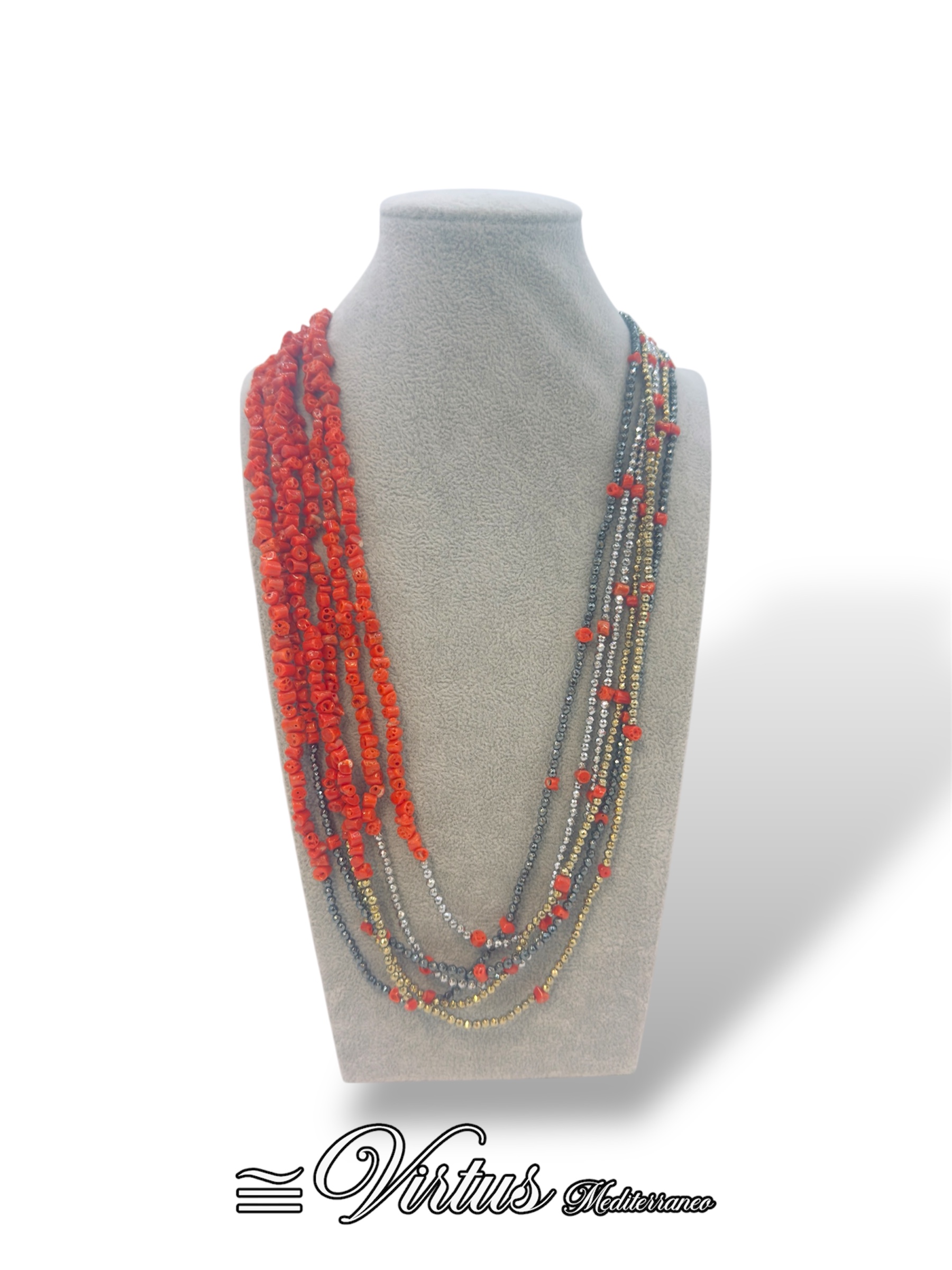Collana artigianale corallo Sciacca a sei fili con ematite
