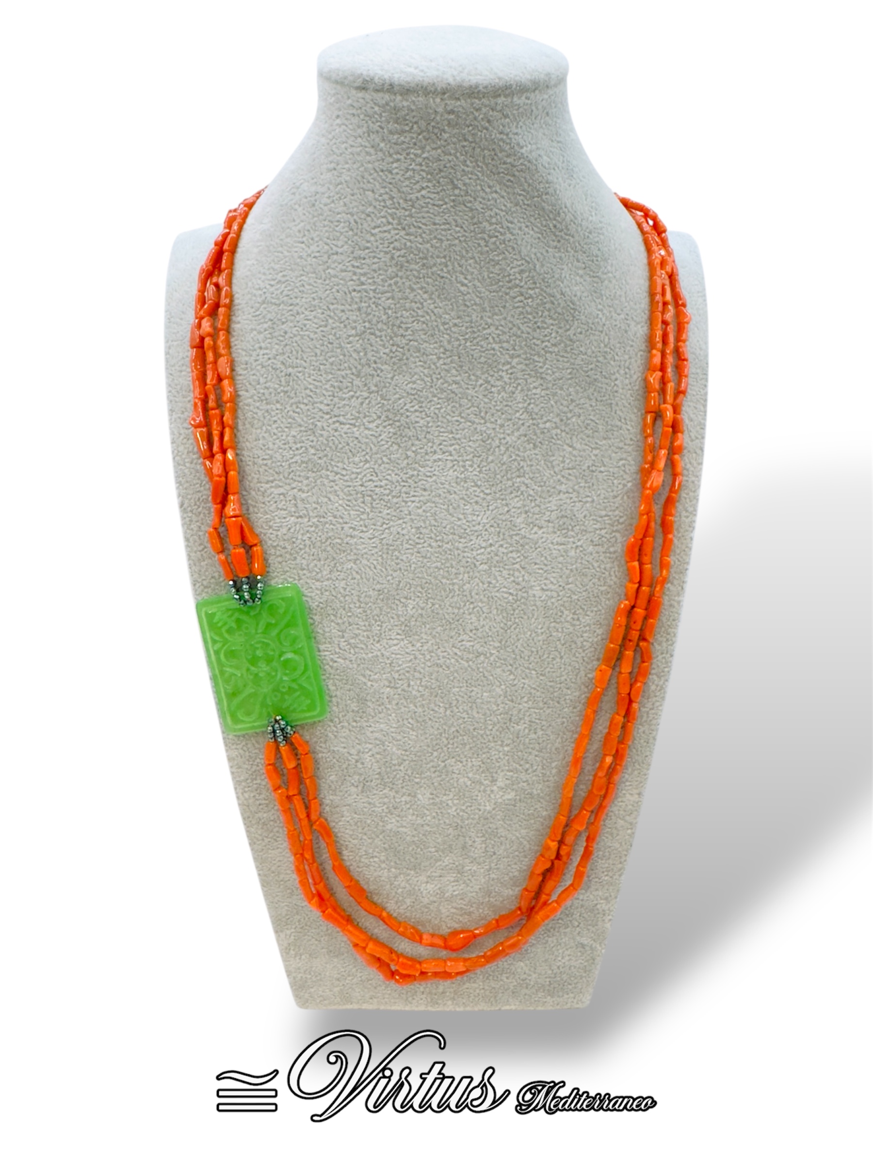 Be the first to review “Collana artigianale corallo Sciacca a tre fili con ematite e giada”