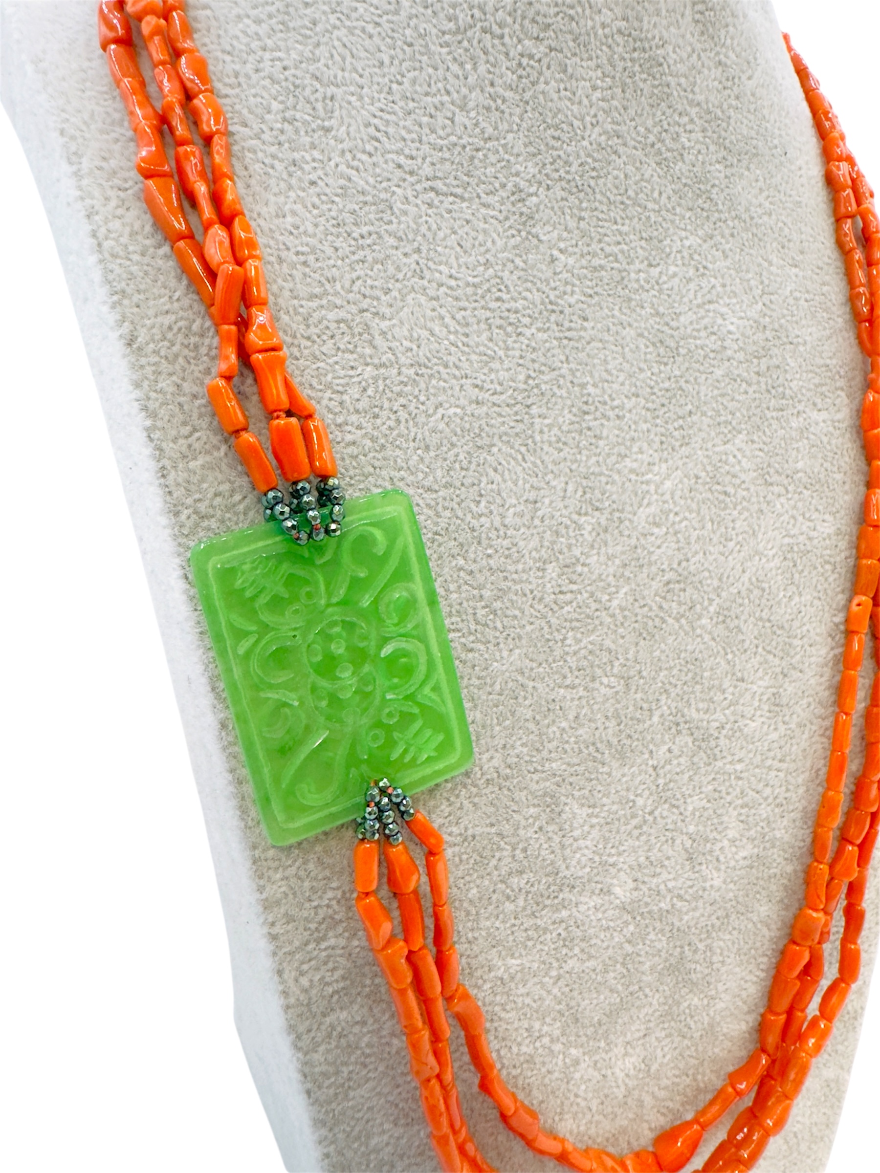 Collana artigianale di corallo Sciacca a tre fili a cannette irregolari, ematite e giada verde intagliata. Chiusura in argento 925.