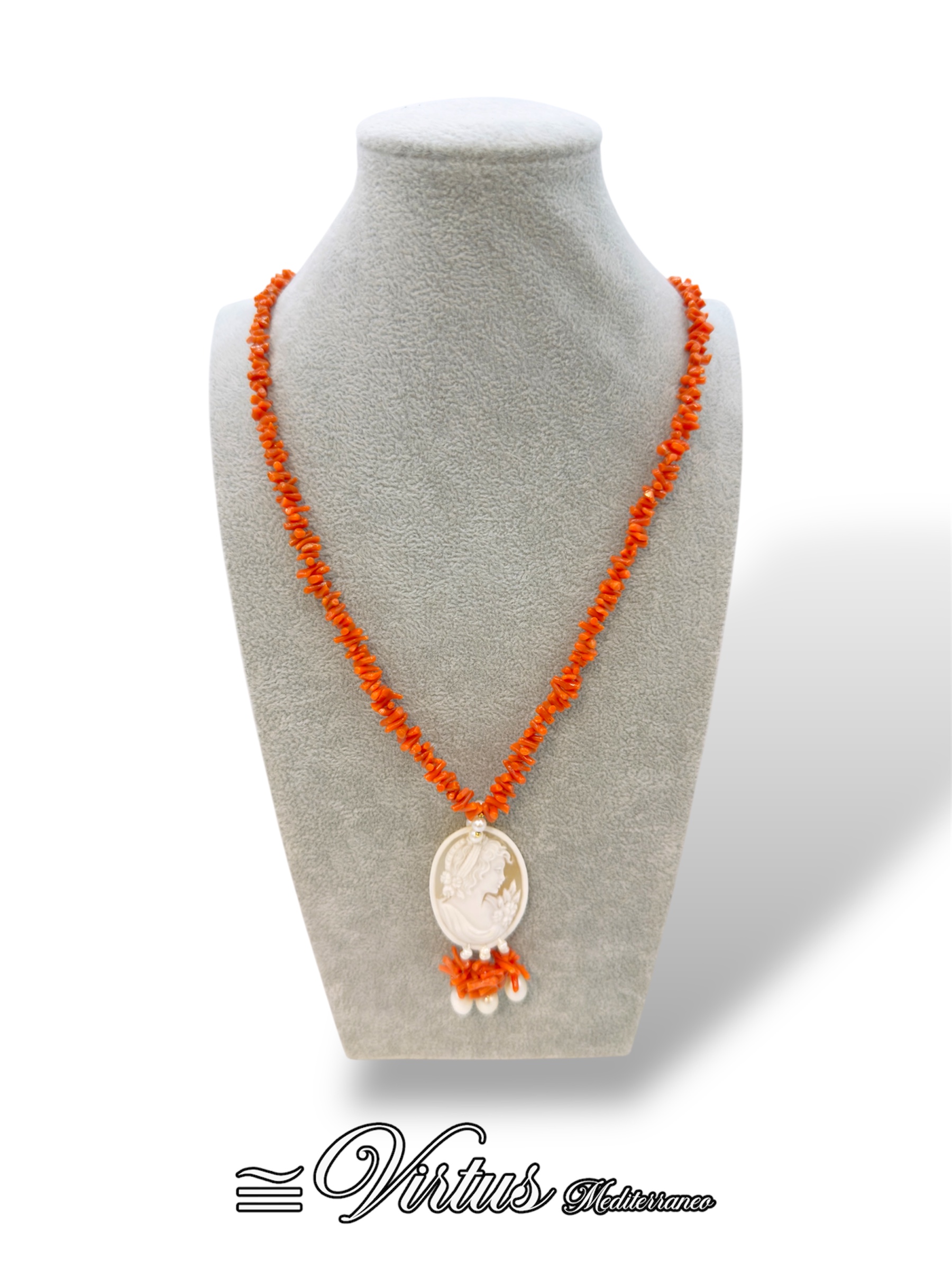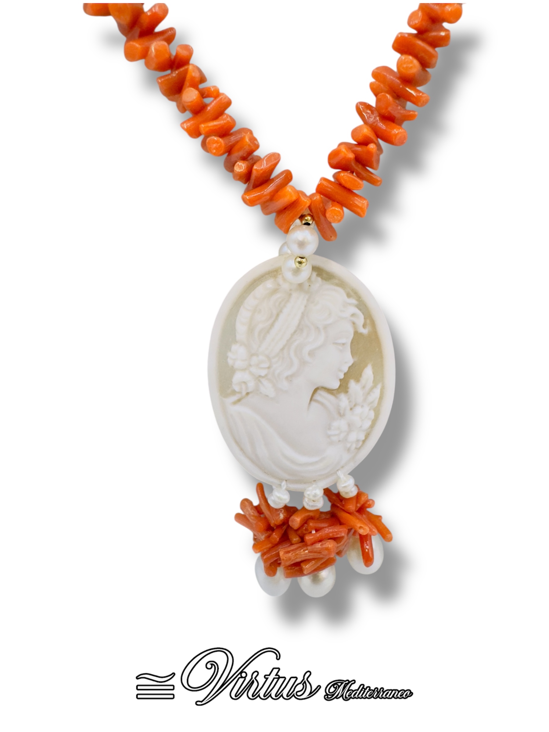 Collana artigianale corallo Sciacca con cammeo donna e perle