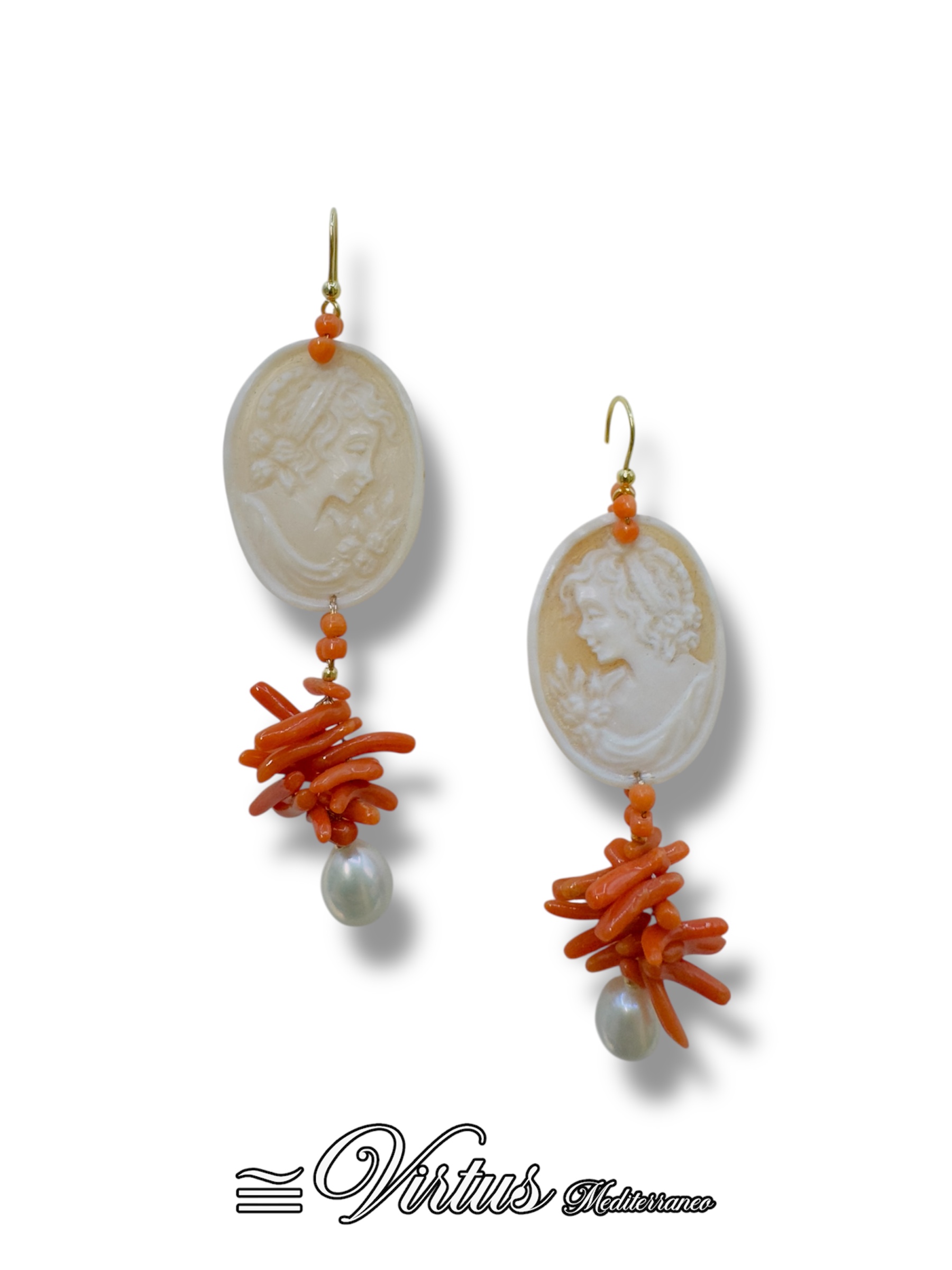 Orecchini corallo Sciacca con cammeo donna, perle e oro