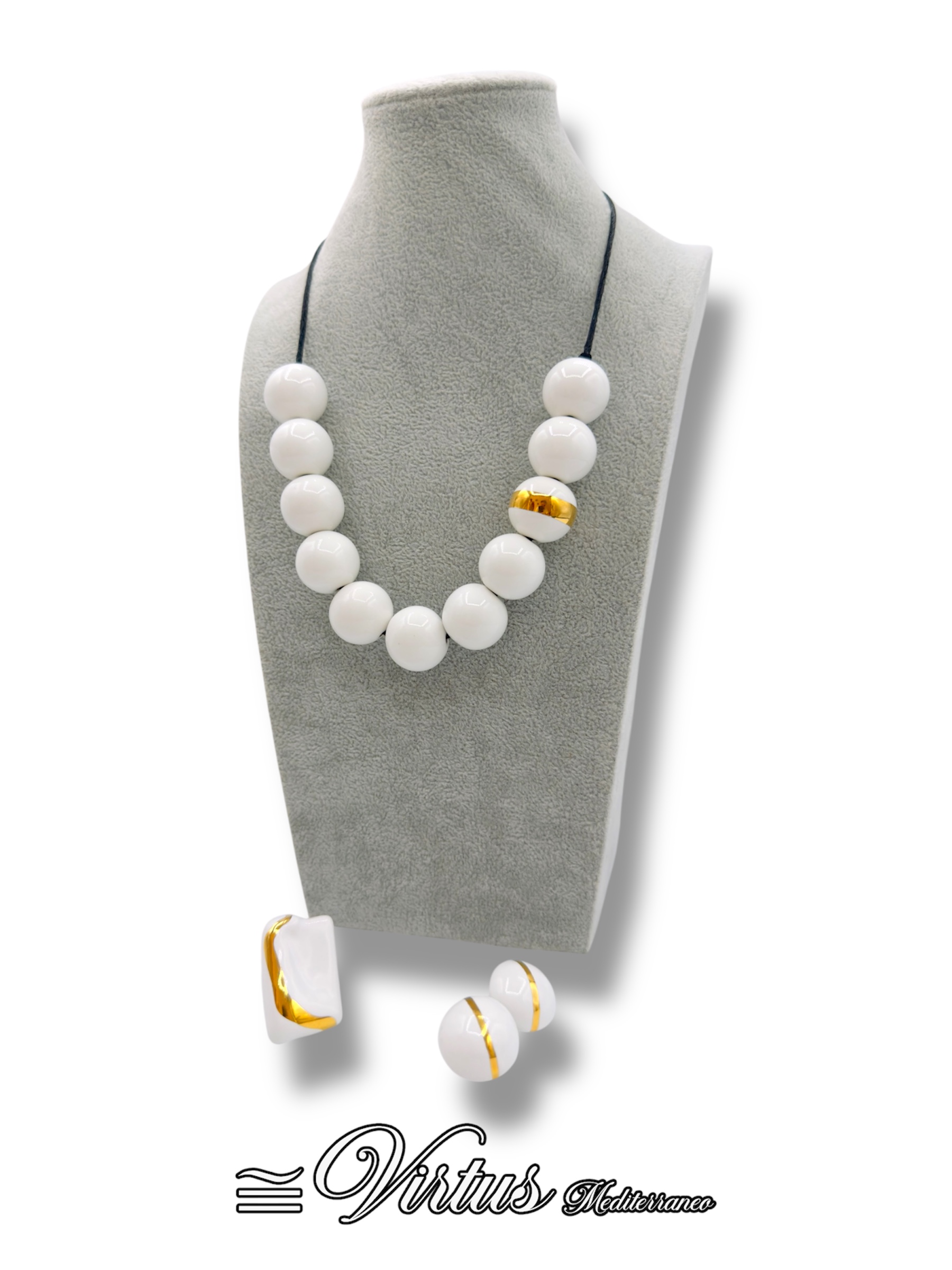 Collana a sfere artigianali in ceramica con laccio coda di topo (3 mm) con orecchini e anello abbinati decorati in oro – tutti con chiusura in acciaio inox anallergico multi colore