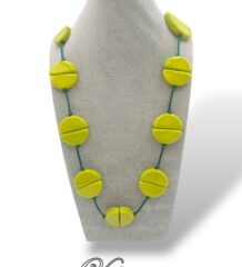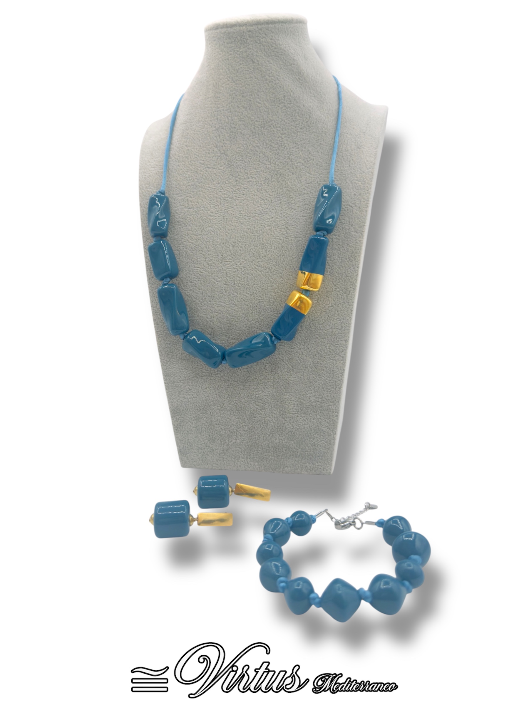 Collana a torciglioni artigianali in ceramica decorata in oro con laccio coda di topo (3mm) con orecchini artigianali in ceramica e bracciale a sfera abbinati – tutti con chiusura in acciaio inox anallergico multi colore